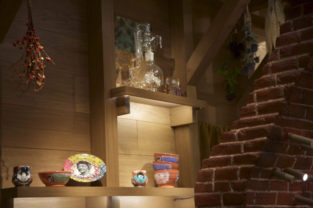 There are over twenty pieces from pre-20th Century times (glassware, ceramics, wooden items such as a churn and a salt box, metal items such as a kettle) as well as more artistic older items from Africa (a cross, a hair comb). There are several contemporary pieces created by Roberto Lugo, including many “period cups” decorated with the faces of remarkable African-Americans (Gabrielle Union, Frederick Douglass, etc.) and plates with faces (Nina Simone, Beyonce, etc.). The room features a variety of chairs and other furnishings, a few paintings and other artworks.