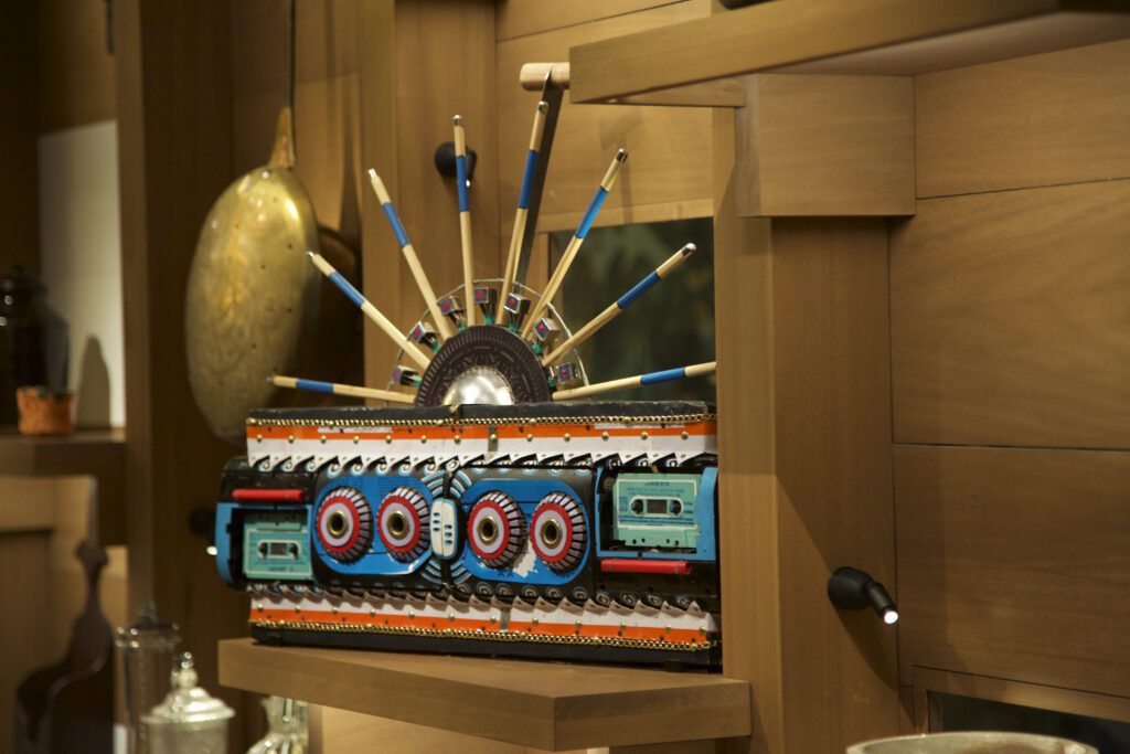 There were so many different parts to this imagined tableau, but a few stood out for me. The Lion Man #1 comic book (originally produced by All-Negro Comics) near the TV set; the colorful; and the Jean-Michel Basquiat ceramic cup (created by Lugo) caught my eye. The square TV set with multiple screens was intriguing, and it shows a video by Jenn Nkiru.