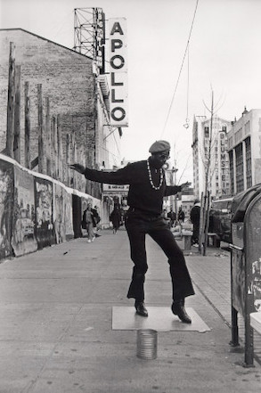- a man dancing on 125th Street in Harlem, looking east. The iconic sign for the Apollo Theater prominent in the background, anchoring us in the location. But the man is the star of each photograph, his arms raised — his movements full of energy. He may not be famous, but he is the star here — no doubt. He is titled: Dancing Harry,