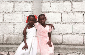 A quartet of color photos show young children in Haiti, sitting on benches. They stare at the camera and, of course, the man behind the camera. Three photos depict pairs, one a trio. These children are at school after a devastating earthquake. Their expressions are humbled, and we know already that their lives have been horrifically altered by the natural disaster. Yet they are adorable, and as you look at them, they are more than children being documented — you want to speak words of assurance to them, offer them hugs, something to eat, toys.